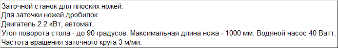 | Заточной станок для плоских ножей. Для заточки ножей дробилок. Двигатель 2.2 кВт, автомат. Угол поворота стола - до 90 градусов. Максимальная длина ножа - 1000 мм. Водяной насос 40 Ватт. Частота вращения заточного круга 3 м/ми. |
