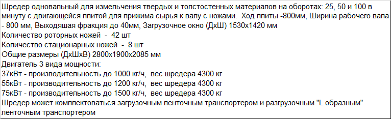 Шредер SHR800 одновальный для измельчения твердых и толстостенных материалов на оборотах: 25, 50 и 100 в минуту с двигающейся плитой для прижима сырья к валу с ножами. Ход плиты -800мм, Ширина рабочего вала - 800 мм, Выходяшая фракция до 40мм, Загрузочное окно (ДхШ) 1530x1420 мм Количество роторных ножей - 42 шт Количество стационарных ножей - 8 шт Общие размеры (ДхШхВ) 2800x1900x2085 мм 37кВт - производительность до 1000 кг/ч, вес шредера 4300 кг 55кВт - производительность до 1200 кг/ч, вес шредера 4300 кг 75кВт - производительность до 1500 кг/ч, вес шредера 4300 кг |