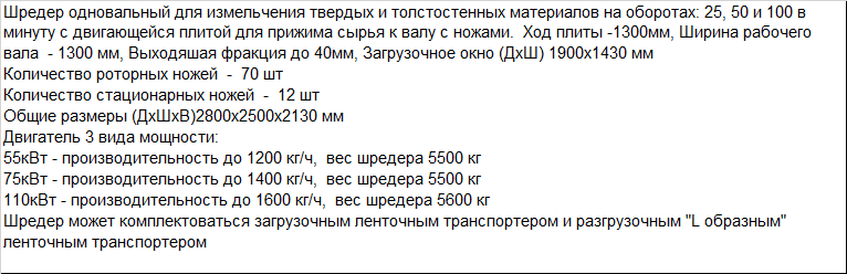 Шредер одновальный SHR1300 для измельчения твердых и толстостенных материалов на оборотах: 25, 50 и 100 в минуту с двигающейся плитой для прижима сырья к валу с ножами. Ход плиты -1300мм, Ширина рабочего вала - 1300 мм, Выходяшая фракция до 40мм, Загрузочное окно (ДхШ) 1900x1430 мм Количество роторных ножей - 70 шт Количество стационарных ножей - 12 шт Общие размеры (ДхШхВ)2800x2500x2130 мм 55кВт - производительность до 1200 кг/ч, вес шредера 5500 кг 75кВт - производительность до 1400 кг/ч, вес шредера 5500 кг 110кВт - производительность до 1600 кг/ч, вес шредера 5600 кг Шредер может комплектоваться загрузочным ленточным транспортером и разгрузочным "L образным" ленточным транспортером |