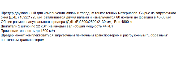 Шредер двухвальный SHR-600D2M для измельчения мягких и твердых тонкостенных материалов. Сырье из загрузочного окна (ДхШ) 1092x1728 мм затягивается двумя валами и измельчается 80 ножами до фракции в 40-60 мм Общие размеры двухвального шредера (ДхШхВ)2800x2500x2130 мм, Вес 4800 кг. Шредер может комплектоваться загрузочным ленточным транспортером и разгрузочным "L образным" ленточным транспортером |