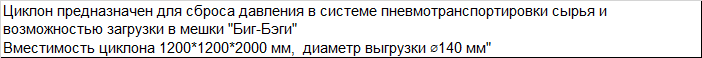 | Циклон Ц450-01 предназначен для сброса давления в системе пневмотранспортировки сырья и возможностью загрузки в мешки "Биг-Бэги" Вместимость циклона 1200*1200*2000 мм, диаметр выгрузки ⌀140 мм" |