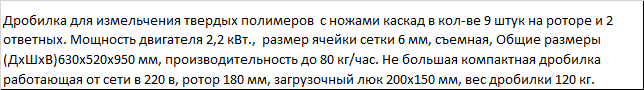 | Дробилка XFS 180 для измельчения твердых полимеров с ножами каскад в кол-ве 9 штук на роторе и 2 ответных. Мощность двигателя 2,2 кВт., размер ячейки сетки 6 мм, съемная, Общие размеры (ДхШхВ)630x520x950 мм, производительность до 80 кг/час. Не большая компактная дробилка работающая от сети в 220 в, ротор 180 мм, загрузочный люк 200х150 мм, вес дробилки 120 кг. |