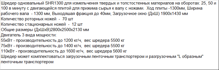 Шредер одновальный SHR1300 для измельчения твердых и толстостенных материалов на оборотах: 25, 50 и 100 в минуту с двигающейся плитой для прижима сырья к валу с ножами. Ход плиты -1300мм, Ширина рабочего вала - 1300 мм, Выходящая фракция до 40мм, Загрузочное окно (ДхШ) 1900x1430 мм Количество роторных ножей - 70 шт Количество стационарных ножей - 12 шт Общие размеры (ДхШхВ)2800x2500x2130 мм 55кВт - производительность до 1200 кг/ч, вес шредера 5500 кг 75кВт - производительность до 1400 кг/ч, вес шредера 5500 кг 110кВт - производительность до 1600 кг/ч, вес шредера 5600 кг Шредер может комплектоваться загрузочным ленточным транспортером и разгрузочным "L образным" ленточным транспортером Цена указана за 55 кВт шредер |