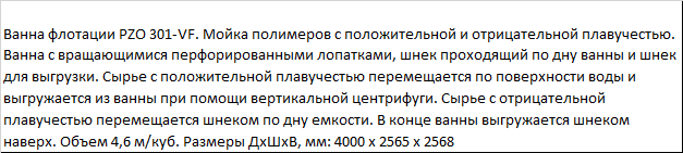 | Ванна флотации PZO 301-VF. Мойка полимеров с положительной и отрицательной плавучестью. Ванна с вращающимися перфорированными лопатками, шнек проходящий по дну ванны и шнек для выгрузки. Сырье с положительной плавучестью перемещается по поверхности воды и выгружается из ванны при помощи вертикальной центрифуги. Сырье с отрицательной плавучестью перемещается шнеком по дну емкости. В конце ванны выгружается шнеком наверх. Объем 4,6 м/куб. Размеры ДхШхВ, мм: 4000 х 2565 х 2568 |