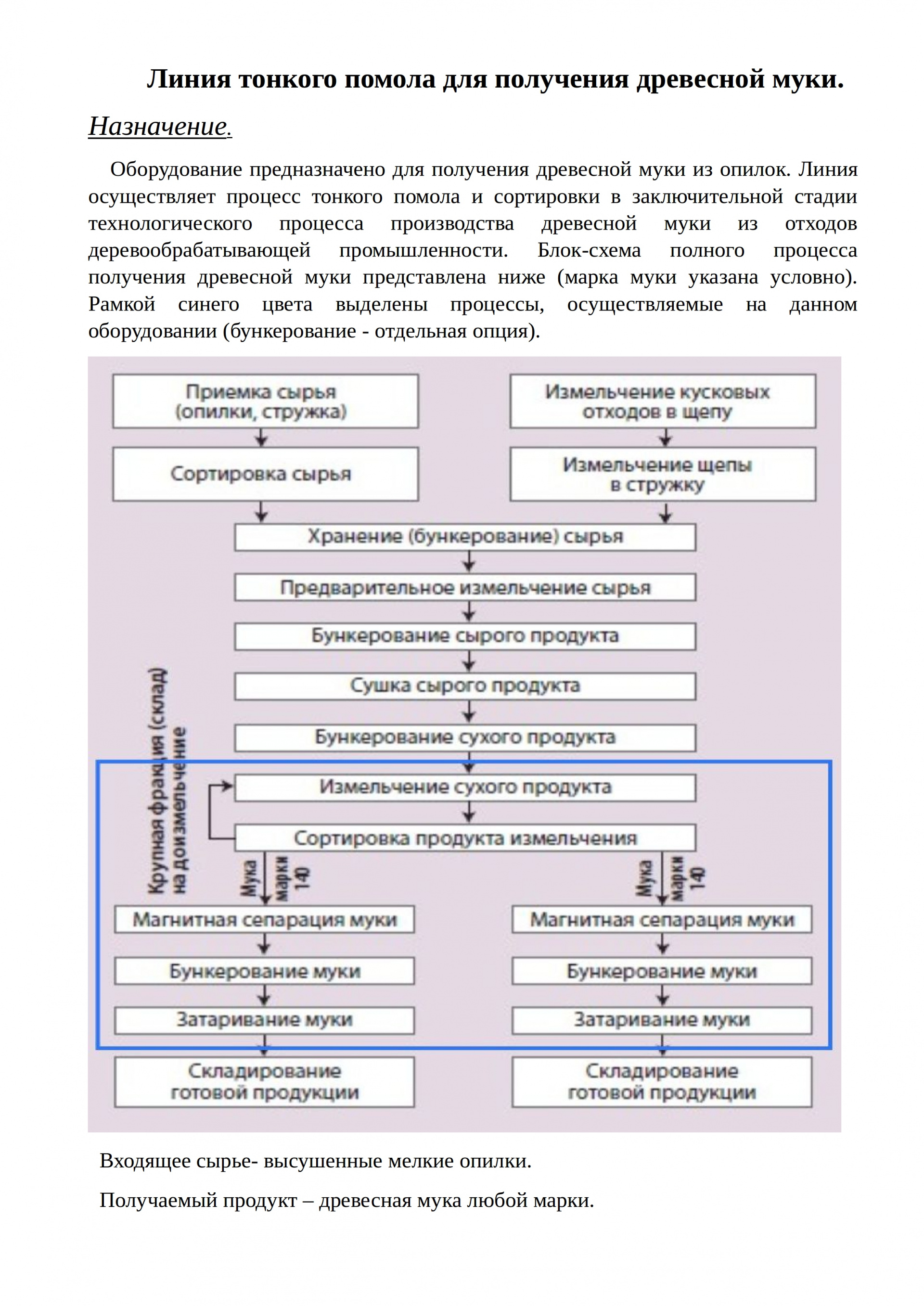 Оборудование предназначено для получения древесной муки из опилок. Линия осуществляет процесс тонкого помола и сортировки в заключительной стадии технологического процесса производства древесной муки из отходов деревообрабатывающей промышленности.
