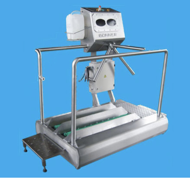 Механическую чистку и дезинфекцию подошв обуви выполняют две горизонтальные вращающиеся щетки со спиралеобразным расположением щетины, расположенные под решеткой из нержавеющей стали, на которую наступают сотрудники при прохождении через санпропускник. Щетина щеток выступает над уровнем решетки на 15 - 20 мм, что является достаточным для удаления загрязнений из рельефных углублений в подошве обуви. Активация вращения щеток санпропускника осуществляется автоматически при помощи фотоэлементов. Специальный коллектор обеспечивает равномерную подачу дезинфицирующего раствора по всей длине щеток. Подача дезинфицирующего раствора на щетки выполняется автоматически и синхронизирована с включением вращения щеток, после отключения вращения щеток подача дезинфицирующего раствора прекращается. Продолжительность вращения щеток программируется при помощи контроллера-программатора PLC. Концентрация дезинфицирующего раствора контролируется автоматически при помощи специального инжектора со сменными дозирующими форсунками (входят в комплект поставки).
