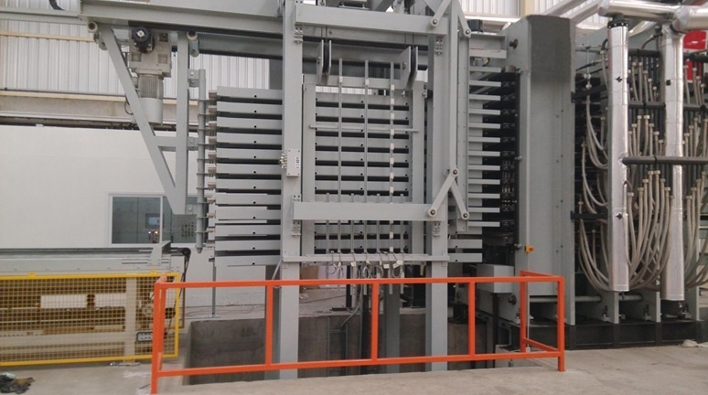 Горячий пресс для ламинирования фанеры, МДФ, ХДФ, фенольной бумагой и меламиновой плёнкой 1220*2440 мм на 12 слоёв. Представляет собой линию с автоматической, одновременной загрузкой и выгрузкой.