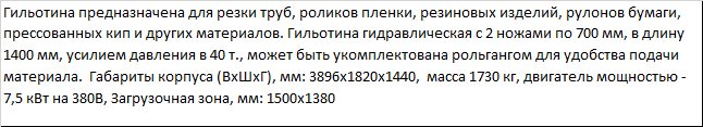 | Гильотина предназначена для резки труб, роликов пленки, резиновых изделий, рулонов бумаги, прессованных кип и других материалов. Гильотина гидравлическая с 2 ножами по 700 мм, в длину 1400 мм, усилием давления в 40 т., может быть укомплектована рольгангом для удобства подачи материала. Габариты корпуса (ВхШхГ), мм: 3896x1820x1440, масса 1730 кг, двигатель мощностью - 7,5 кВт на 380В, Загрузочная зона, мм: 1500х1380 |