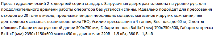 | Пресс гидравлический 2-х дверный серии стандарт. Загрузочная дверь расположена на уровне рук, для продолжительного времени работы оператора без усталости спины. Идеально подойдет для прессования отходов до 20 тонн в месяц, предназначен для небольших складов, магазинов и других компаний, чья деятельность связана с возникновением ТБО, Усилие прессования в 4 тонны, Вес тюка до 60 кг, 2 ленты обвязки. Габариты загрузочной двери 500х750 мм, Габариты тюка ВxШxГ (мм) 700x750x500, Габариты пресса ВxШxГ (мм) 2350x1150x600 масса 450 кг, двигатели: 220В - 1,5 кВт, 380 В - 1,5 кВт |