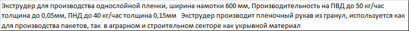 | Экструдер для производства однослойной пленки, ширина намотки 600 мм, Производительность на ПВД до 50 кг/час толщина до 0,05мм, ПНД до 40 кг/час толщина 0,15мм Экструдер производит пленочный рукав из гранул, используется как для производства пакетов, так в аграрном и строительном секторе как укрывной материал |