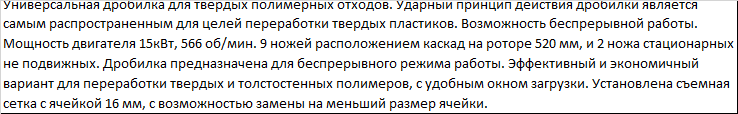 | Универсальная дробилка для твердых полимерных отходов. Ударный принцип действия дробилки является самым распространенным для целей переработки твердых пластиков. Возможность беспрерывной работы. Мощность двигателя 15кВт, 566 об/мин. 9 ножей расположением каскад на роторе 520 мм, и 2 ножа стационарных не подвижных. Дробилка предназначена для беспрерывного режима работы. Эффективный и экономичный вариант для переработки твердых и толстостенных полимеров, с удобным окном загрузки. Установлена съемная сетка с ячейкой 16 мм, с возможностью замены на меньший размер ячейки. |