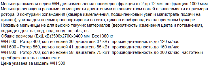 Мельница ножевая серии WH для измельчения полимеров фракции от 2 до 12 мм, во фракцию 1000 мкм. Мельница оснащена разными по мощности двигателями и количеством ножей в зависимости от размера ротора, 3 контурами охлаждения (камера измельчения, подшипниковый узел и магистраль подачи на циклон), улитка для пневмотранспортировки на сито, циклон и виброподача на приемном бункере. Ножевые мельницы не для высоко текучих материалов (вероятность изменения цвета и потемнения), подходит для: пэ, пвд, пнд, лпвд, пп, абс, пс. Общие размеры (ДхШхВ)3500x2700x3400 мм Вес1380 кг WH 500 - Ротор 460, кол-во ножей 36, двигатель 37 кВт, производительность до 120 кг/час |