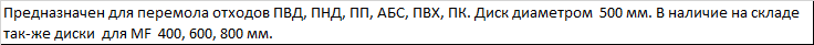 | Предназначен для перемола отходов ПВД, ПНД, ПП, АБС, ПВХ, ПК. Диск диаметром 500 мм. В наличие на складе так-же диски для MF 400, 600, 800 мм. |