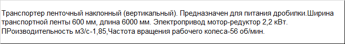 | Транспортер ленточный наклонный (вертикальный). Предназначен для питания дробилки.Ширина транспортной ленты 600 мм, длина 6000 мм. Электропривод мотор-редуктор 2,2 кВт. ПРоизводительность м3/с-1,85,Частота вращения рабочего колеса-56 об/мин. |