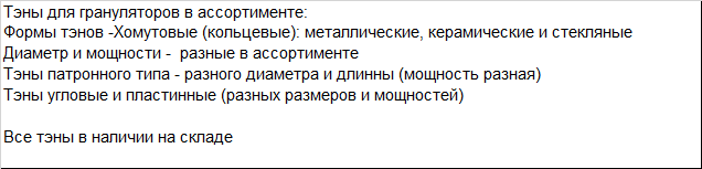 | Тэны для грануляторов в ассортименте: Формы тэнов -Хомутовые (кольцевые): металлические, керамические и стекляные Диаметр и мощности - разные в ассортименте Тэны патронного типа - разного диаметра и длинны (мощность разная) Тэны угловые и пластинные (разных размеров и мощностей) Все тэны в наличии на складе |
