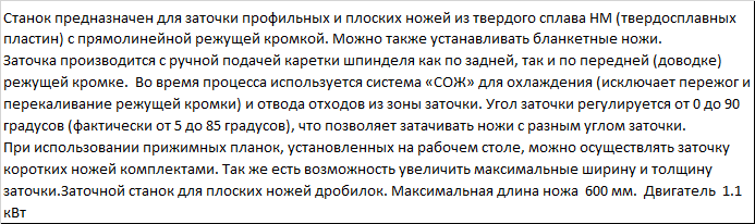 | Станок предназначен для заточки профильных и плоских ножей из твердого сплава HM (твердосплавных пластин) с прямолинейной режущей кромкой. Можно также устанавливать бланкетные ножи. Заточка производится с ручной подачей каретки шпинделя как по задней, так и по передней (доводке) режущей кромке. Во время процесса используется система «СОЖ» для охлаждения (исключает пережог и перекаливание режущей кромки) и отвода отходов из зоны заточки. Угол заточки регулируется от 0 до 90 градусов (фактически от 5 до 85 градусов), что позволяет затачивать ножи с разным углом заточки. При использовании прижимных планок, установленных на рабочем столе, можно осуществлять заточку коротких ножей комплектами. Так же есть возможность увеличить максимальные ширину и толщину заточки.Заточной станок для плоских ножей дробилок. Мaксимальная длина ножа 600 мм. Двигатель 1.1 кВт |