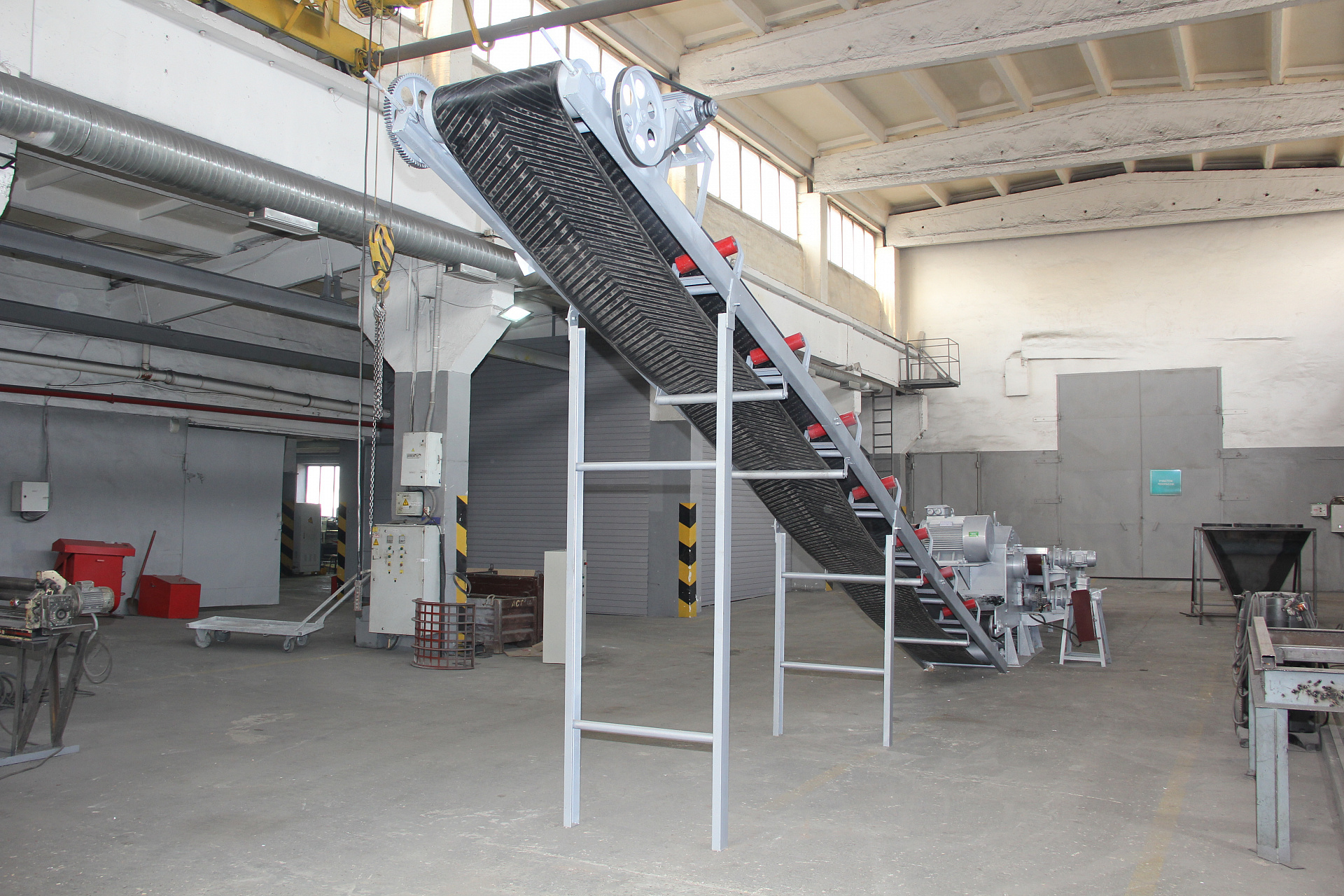 Применение: конвейер ленточный скребковый предназначен для транспортировки топливных гранул (пеллет), комбикорма, зерна и других сыпучих продуктов, схожих по структуре, в стационарных условиях в горизонтальном или наклонном направлении (угол наклона до 400).