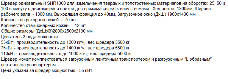 Шредер одновальный SHR1300 для измельчения твердых и толстостенных материалов на оборотах: 25, 50 и 100 в минуту с двигающейся плитой для прижима сырья к валу с ножами. Ход плиты -1300мм, Ширина рабочего вала - 1300 мм, Выходяшая фракция до 40мм, Загрузочное окно (ДхШ) 1900x1430 мм Количество роторных ножей - 70 шт Количество стационарных ножей - 12 шт Общие размеры (ДхШхВ)2800x2500x2130 мм 55кВт - производительность до 1200 кг/ч, вес шредера 5500 кг 75кВт - производительность до 1400 кг/ч, вес шредера 5500 кг 110кВт - производительность до 1600 кг/ч, вес шредера 5600 кг Шредер может комплектоваться загрузочным ленточным транспортером и разгрузочным "L образным" ленточным транспортером Цена указана за шредер мощностью - 55 кВт |