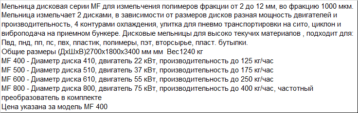 Мельница дисковая серии MF для измельчения полимеров фракции от 2 до 12 мм, во фракцию 1000 мкм. Мельница измельчает 2 дисками, в зависимости от размеров дисков разная мощность двигателей и производительность, 4 контурами охлаждения, улитка для пневмо транспортировки на сито, циклон и виброподача на приемном бункере. Дисковые мельницы для высоко текучих материалов , подходит для: Пвд, пнд, пп, пс, пвх, пластик, полимеры, пэт, вторсырье, пласт. бутылки. Общие размеры (ДхШхВ) 2700x1800x3400 мм Вес 1240 кг MF 400 - Диаметр диска 410, двигатель 22 кВт, производительность до 125 кг/час MF 500 - Диаметр диска 510, двигатель 37 кВт, производительность до 175 кг/час MF 600 - Диаметр диска 610, двигатель 55 кВт, производительность до 250 кг/час MF 800 - Диаметр диска 800, двигатель 75 кВт, производительность до 400 кг/час, частотный преобразователь в комплекте Цена указана за модель MF 400 |
