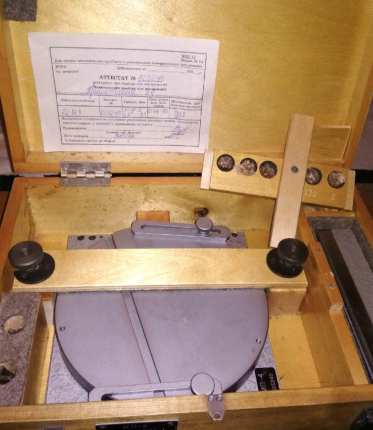 Пристрій для вимірювання різьбових кілець ІП-4 є додатковою приналежністю до горизонтального оптиметра ІКГ і призначається для вимірювання середнього діаметра внутрішнього різьблення з кроком 1,5-3,5 мм у межах 17-50 мм.