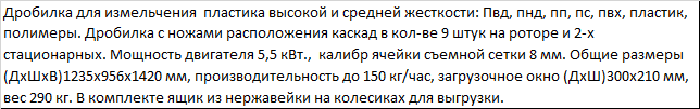 | Дробилка для измельчения пластика высокой и средней жесткости: Пвд, пнд, пп, пс, пвх, пластик, полимеры. Дробилка с ножами расположения каскад в кол-ве 9 штук на роторе и 2-х стационарных. Мощность двигателя 5,5 кВт., калибр ячейки съемной сетки 8 мм. Общие размеры (ДхШхВ)1235x956x1420 мм, производительность до 150 кг/час, загрузочное окно (ДхШ)300x210 мм, вес 290 кг. В комплекте ящик из нержавейки на колесиках для выгрузки. |