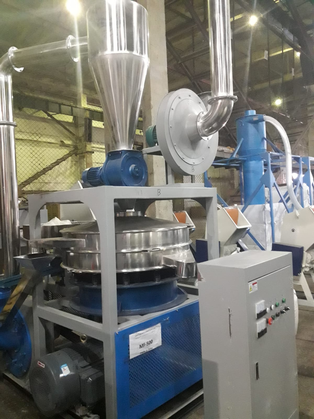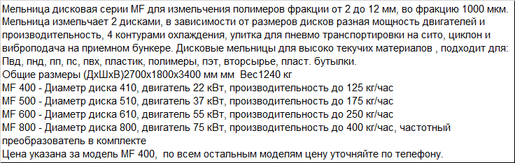 Мельница дисковая серии MF для измельчения полимеров фракции от 2 до 12 мм, во фракцию 1000 мкм. Мельница измельчает 2 дисками, в зависимости от размеров дисков разная мощность двигателей и производительность, 4 контурами охлаждения, улитка для пневмо транспортировки на сито, циклон и виброподача на приемном бункере. Дисковые мельницы для высоко текучих материалов , подходит для: Пвд, пнд, пп, пс, пвх, пластик, полимеры, пэт, вторсырье, пласт. бутылки. Общие размеры (ДхШхВ)2700x1800x3400 мм мм Вес1240 кг MF 400 - Диаметр диска 410, двигатель 22 кВт, производительность до 125 кг/час MF 500 - Диаметр диска 510, двигатель 37 кВт, производительность до 175 кг/час MF 600 - Диаметр диска 610, двигатель 55 кВт, производительность до 250 кг/час MF 800 - Диаметр диска 800, двигатель 75 кВт, производительность до 400 кг/час, частотный преобразователь в комплекте Цена указана за модель MF 400, по всем остальным моделям цену уточняйте по телефону. |