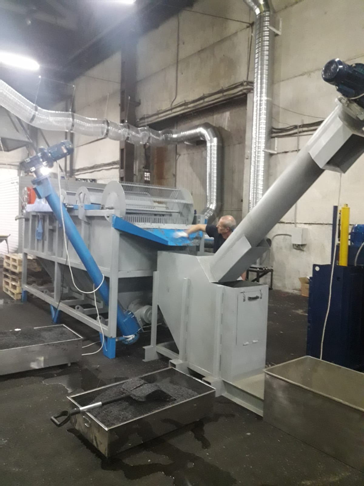 | Мойка полимеров с положительной и отрицательной плавучестью. Ванна флотации PZO-VF302+ в комплекте с приставным шнековым транспортером PZO-VH. Сырье с положительной плавучестью выгружается из ванны по лотку и попадает в зону загрузки шнекового транспортера. Там материал отделяется от влаги через перфорированное дно транспортера и перемещается вращающимся шнековым валом в зону выгрузки.Объём воды- 5500 л. |