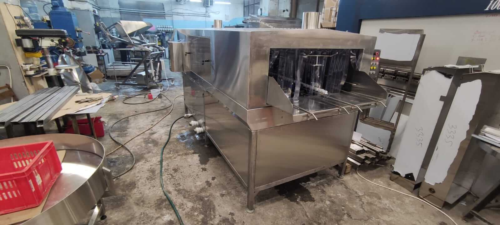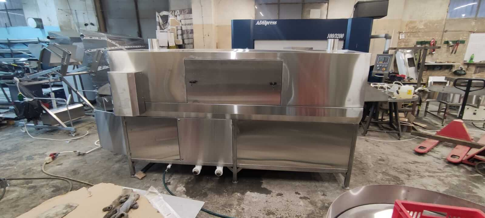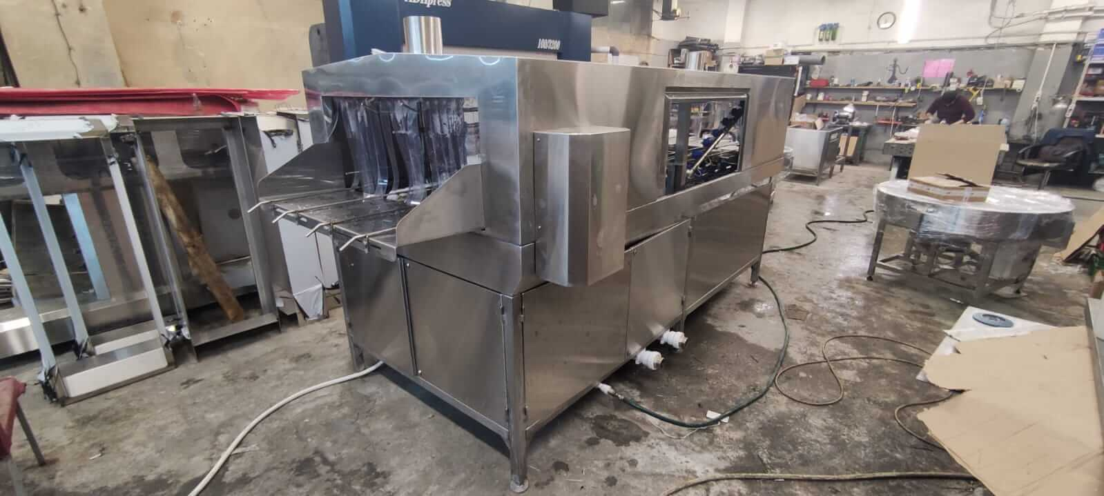 Принцип работы машины туннельного типа заключается в следующем: омываемые ящики подаются на приемный лоток один за другим по ходу движения конвейерной цепи. Посредством зацепов, расположенных на конвейере, они перемещаются по туннелю. Ящик попадает в отсек мойки и под давлением по средствам форсунок происходит мойка ящика заданным моющим раствором (подготавливается раствор в резервуаре-накопителе, подогрев раствора до нужной температуры – по средством пара или ТЭНов, и дозирование моющего средства до необходимой концентрации – автоматическое, при помощи перистальтического насоса), далее по движению конвейера – ополаскивание (ополаскивание чистой водопроводной водой). По завершении мойки и ополаскивания, чистые ящики подаются на выходной лоток, откуда забираются оператором.