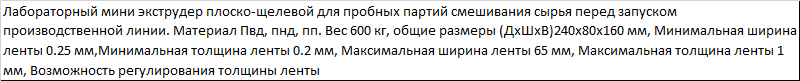 | Лабораторный мини экструдер плоско-щелевой для пробных партий смешивания сырья перед запуском производственной линии. Материал Пвд, пнд, пп. Вес 600 кг, общие размеры (ДхШхВ)240x80x160 мм, Минимальная ширина ленты 0.25 мм,Минимальная толщина ленты 0.2 мм, Максимальная ширина ленты 65 мм, Максимальная толщина ленты 1 мм, Возможность регулирования толщины ленты |