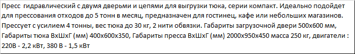 | Пресс гидравлический с двумя дверьми и цепями для выгрузки тюка, серии компакт. Идеально подойдет для прессования отходов до 5 тонн в месяц, предназначен для гостинец, кафе или небольших магазинов. Прессует с усилием 4 тонны, вес тюка до 30 кг, 2 нити обвязки. Габариты загрузочной двери 500х600 мм, Габариты тюка ВxШxГ (мм) 400x600x350, Габариты пресса ВxШxГ (мм) 2000x950x450 масса 250 кг, двигатели : 220В - 2,2 кВт, 380 В - 1,5 кВт |
