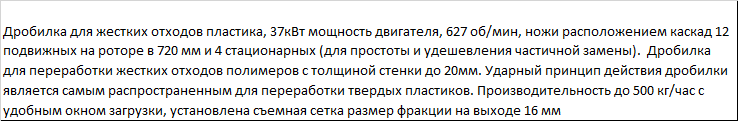 | Дробилка для жестких отходов пластика, 37кВт мощность двигателя, 627 об/мин, ножи расположением каскад 12 подвижных на роторе в 720 мм и 4 стационарных (для простоты и удешевления частичной замены). Дробилка для переработки жестких отходов полимеров с толщиной стенки до 20мм. Ударный принцип действия дробилки является самым распространенным для переработки твердых пластиков. Производительность до 500 кг/час с удобным окном загрузки, установлена съемная сетка размер фракции на выходе 16 мм |