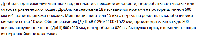 | Дробилка для измельчения всех видов пластика высокой жесткости, перерабатывает чистые или слабозагрязненных отходы . Дробилка снабжена 18 каскадными ножами на роторе длинной 600 мм и 4 стационарными ножами. Мощность двигателя 15 кВт., передача ременная, калибр ячейки съемной сетки 10 мм. Общие размеры (ДхШхВ)1296x1100x1522 мм, производительность до 300 кг/час, загрузочное окно (ДхШ)600x240 мм, вес дробилки 820 кг. Выгрузка горка, в комплекте ящик из нержавейки на колесиках. |