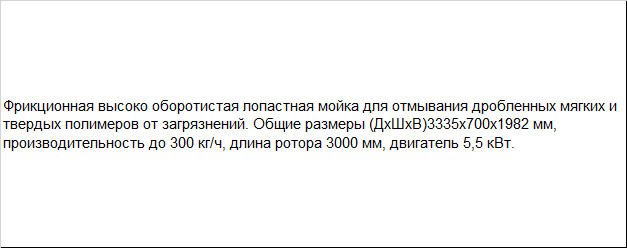 | Фрикционная высоко оборотистая лопастная мойка для отмывания дробленных мягких и твердых полимеров от загрязнений. Общие размеры (ДхШхВ)3335x700x1982 мм, производительность до 300 кг/ч, длина ротора 3000 мм, двигатель 5,5 кВт. |