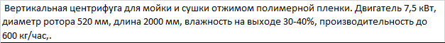 | Вертикальная центрифуга для мойки и сушки отжимом полимерной пленки. Двигатель 7,5 кВт, диаметр ротора 520 мм, длина 2000 мм, влажность на выходе 30-40%, производительность до 600 кг/час,. |