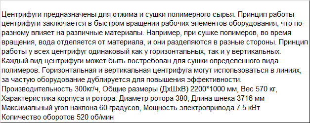 | Центрифуги предназначены для отжима и сушки полимерного сырья. Принцип работы центрифуги заключается в быстром вращении рабочих элементов оборудования, что по-разному влияет на различные материалы. Например, при сушке полимеров, во время вращения, вода отделяется от материала, и они разделяются в разные стороны. Принцип работы у всех центрифуг одинаковый как у горизонтальных, так и у вертикальных. Каждый вид центрифуги может быть востребован для сушки определенного вида полимеров. Горизонтальная и вертикальная центрифуга могут использоваться в линиях, за частую оборудование дублируется для повышения эффективности. Производительность 300кг/ч, Общие размеры (ДхШхВ) 2200*1000 мм, Вес 570 кг, Характеристика корпуса и ротора: Диаметр ротора 380, Длина шнека 3716 мм Максимальный угол наклона 60 градусов, Мощность электропривода 7.5 кВт Количество оборотов 520 об/мин |