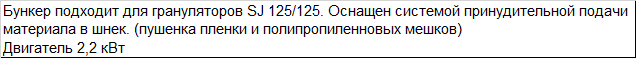 | Бункер подходит для грануляторов SJ 125/125. Оснащен системой принудительной подачи материала в шнек. (пушенка пленки и полипропиленовых мешков) Двигатель 2,2 кВт |