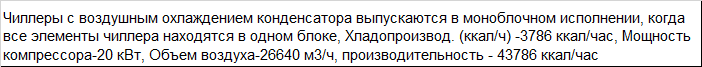 | Чиллер FLK-20HP с воздушным охлаждением конденсатора выпускаются в моноблочном исполнении, когда все элементы чиллера находятся в одном блоке, Хладопроизвод. (ккал/ч) -3786 ккал/час, Мощность компрессора-20 кВт, Объем воздуха-26640 м3/ч, производительность - 43786 ккал/час |