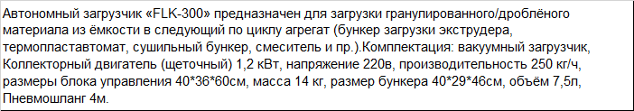 | Автономный загрузчик «FLK-300» предназначен для загрузки гранулированного/дроблёного материала из ёмкости в следующий по циклу агрегат (бункер загрузки экструдера, термопластавтомат, сушильный бункер, смеситель и пр.).Комплектация: вакуумный загрузчик, Коллекторный двигатель (щеточный) 1,2 кВт, напряжение 220в, производительность 250 кг/ч, размеры блока управления 40*36*60см, масса 14 кг, размер бункера 40*29*46см, объём 7,5л, Пневмошланг 4м. |