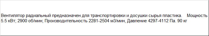 | Вентилятор радиальный предназначен для транспортировки и досушки сырья пластика. Мощность 5.5 кВт; 2900 об/мин; Производительность 2281-2504 м3/мин, Давление 4297-4112 Па. 90 кг |