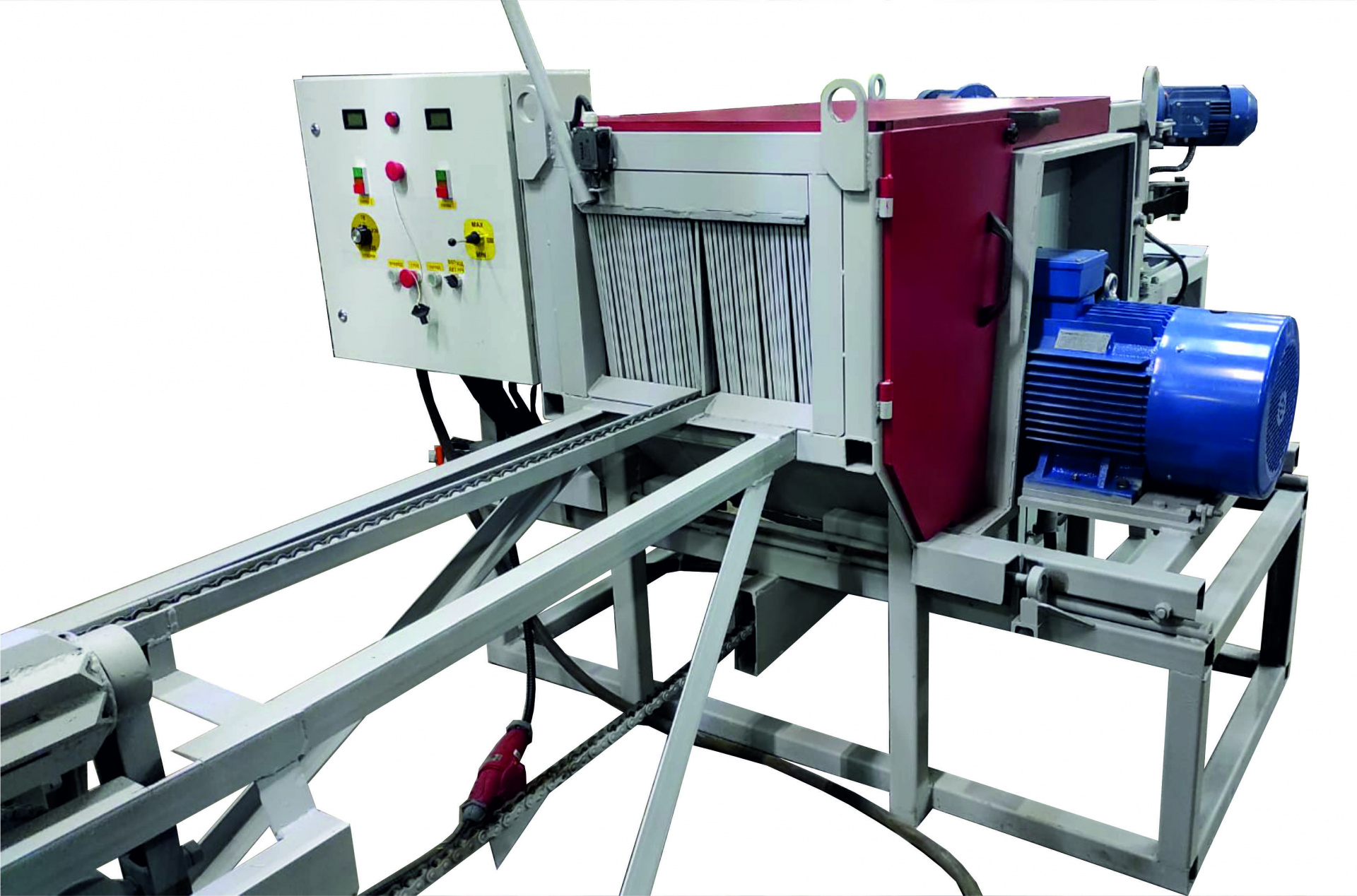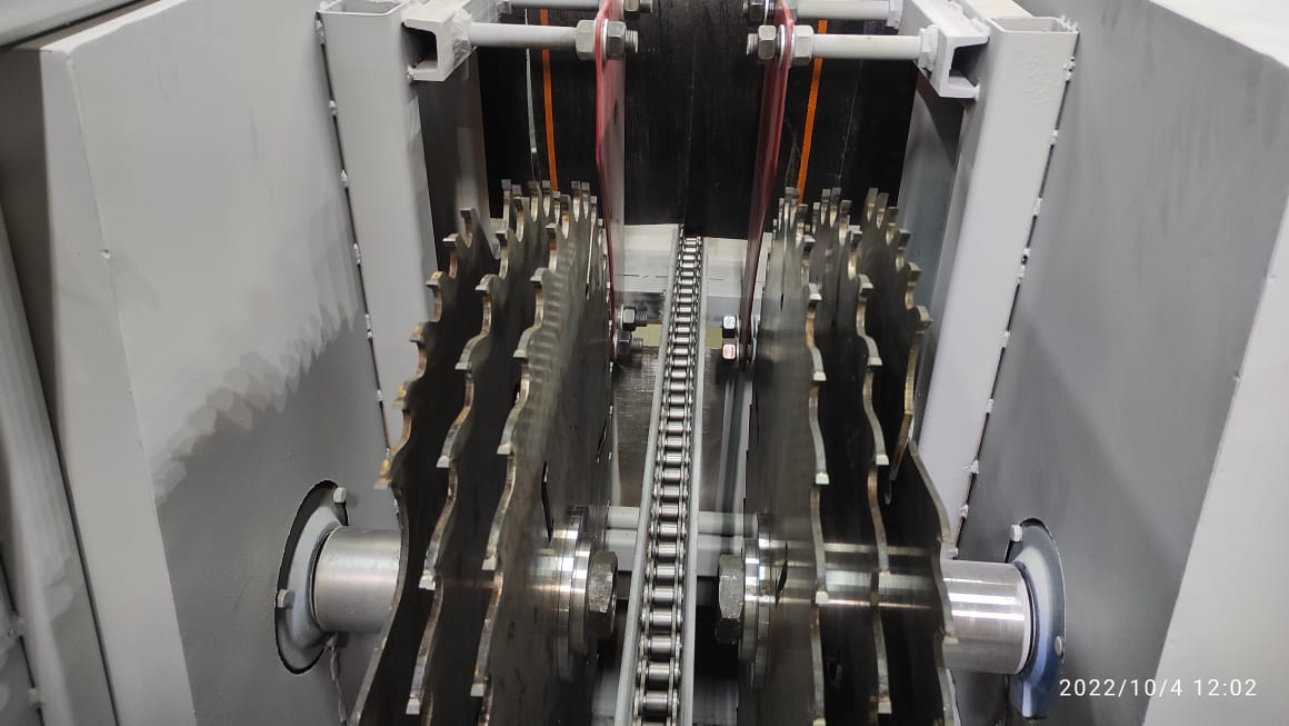 Заготовка подается при помощи цепной передачи непрерывно. Скорость подачи контролируется плавно, при помощи преобразователя частоты. Брусующий станок за один проход производит распиловку бревна круглого сечения на двухкантный брус и две необрезные доски. Далее полученный двухкантный брус (лафет) можно передать на дальнейшую переработку в многопильный станок.