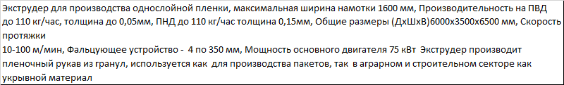 | Экструдер для производства однослойной пленки, максимальная ширина намотки 1600 мм, Производительность на ПВД до 110 кг/час, толщина до 0,05мм, ПНД до 110 кг/час толщина 0,15мм, Общие размеры (ДхШхВ)6000x3500x6500 мм, Скорость протяжки 10-100 м/мин, Фальцующее устройство - 4 по 350 мм, Мощность основного двигателя 75 кВт Экструдер производит пленочный рукав из гранул, используется как для производства пакетов, так в аграрном и строительном секторе как укрывной материал |