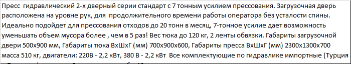 | Пресс гидравлический 2-х дверный серии стандарт с 7 тонным усилием прессования. Загрузочная дверь расположена на уровне рук, для продолжительного времени работы оператора без усталости спины. Идеально подойдет для прессования отходов до 20 тонн в месяц, 7-тонное усилие дает возможность уменьшать объем мусора более , чем в 5 раз! Вес тюка до 120 кг, 2 ленты обвязки. Габариты загрузочной двери 500х900 мм, Габариты тюка ВxШxГ (мм) 700x900x600, Габариты пресса ВxШxГ (мм) 2300x1300x700 масса 510 кг, двигатели: 220В - 2,2 кВт, 380 В - 2,2 кВт Все комплектующие по гидравлике импортные (Турция и Болгария), гарантия 2 года, срок службы 10 лет. |