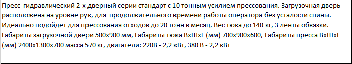 | Пресс гидравлический 2-х дверный серии стандарт с 10 тонным усилием прессования. Загрузочная дверь расположена на уровне рук, для продолжительного времени работы оператора без усталости спины. Идеально подойдет для прессования отходов до 20 тонн в месяц. Вес тюка до 140 кг, 3 ленты обвязки. Габариты загрузочной двери 500х900 мм, Габариты тюка ВxШxГ (мм) 700x900x600, Габариты пресса ВxШxГ (мм) 2400x1300x700 масса 570 кг, двигатели: 220В - 2,2 кВт, 380 В - 2,2 кВт |