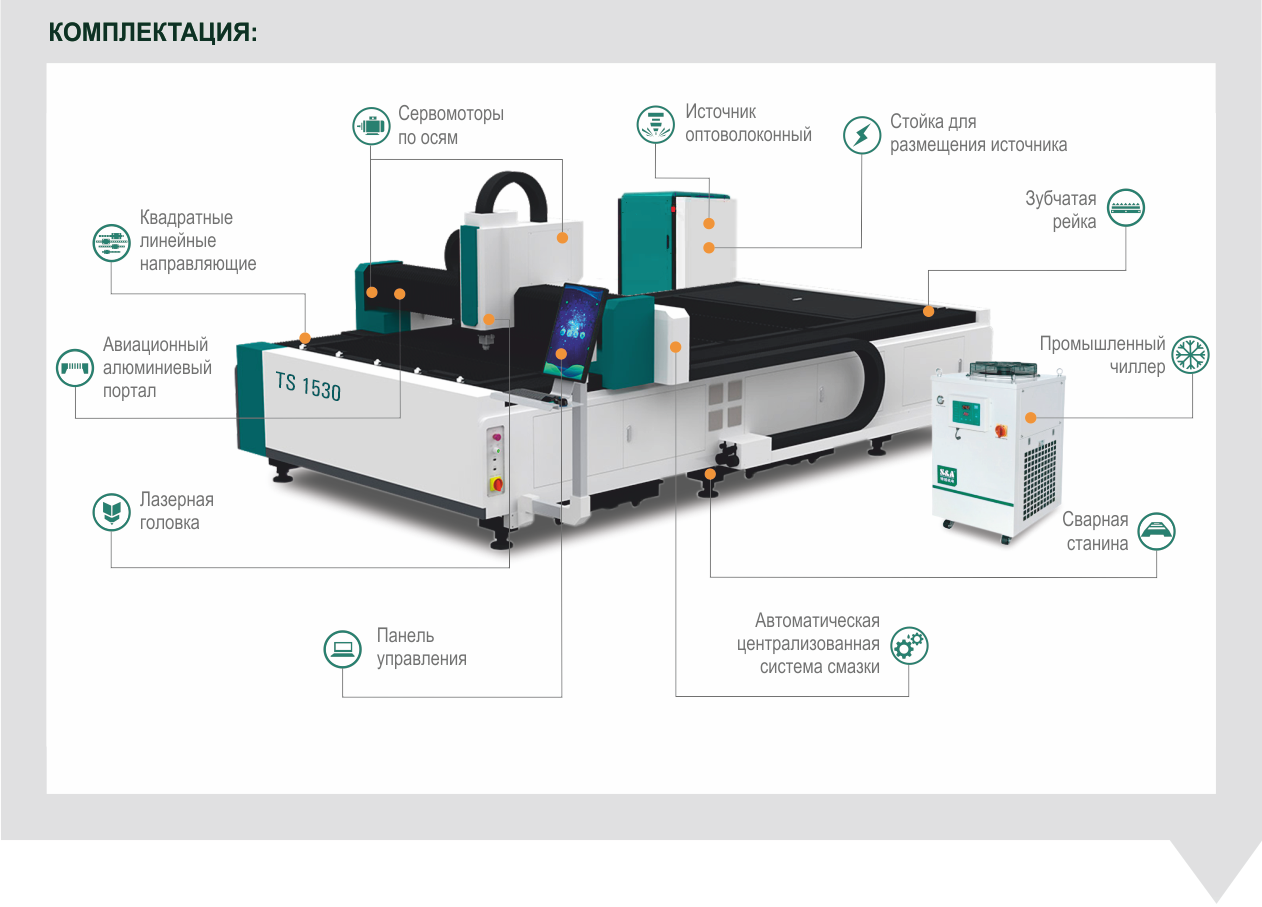 - Высокое качество луча обеспечивает оптоволоконный лазерный источник с возможностью оперативной обработки практически любого металла различной толщины;