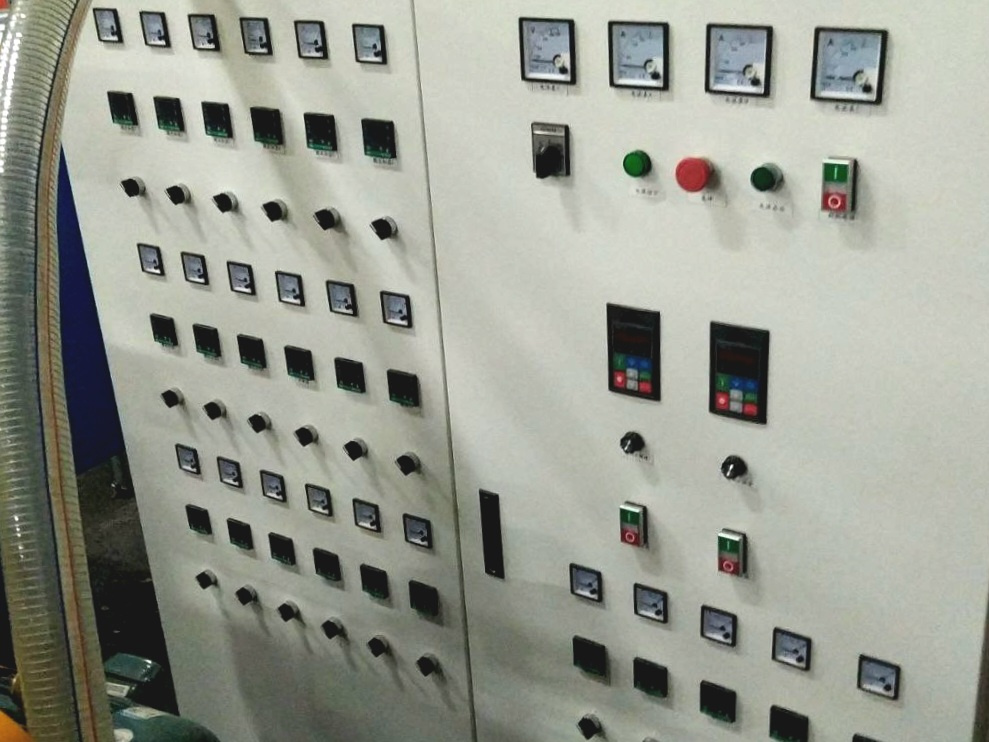 1. Отдельностоящий шкаф управления с дополнительно вынесённой панелью управления частотными преобразавателями в зоне намотки (для удобства оператора).