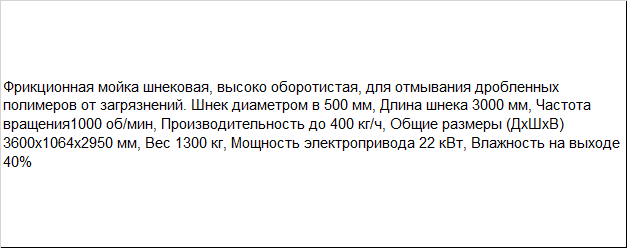 | Фрикционная мойка шнековая, высоко оборотистая, для отмывания дробленных полимеров от загрязнений. Шнек диаметром в 500 мм, Длина шнека 3000 мм, Частота вращения1000 об/мин, Производительность до 400 кг/ч, Общие размеры (ДхШхВ) 3600x1064x2950 мм, Вес 1300 кг, Мощность электропривода 22 кВт, Влажность на выходе 40% |