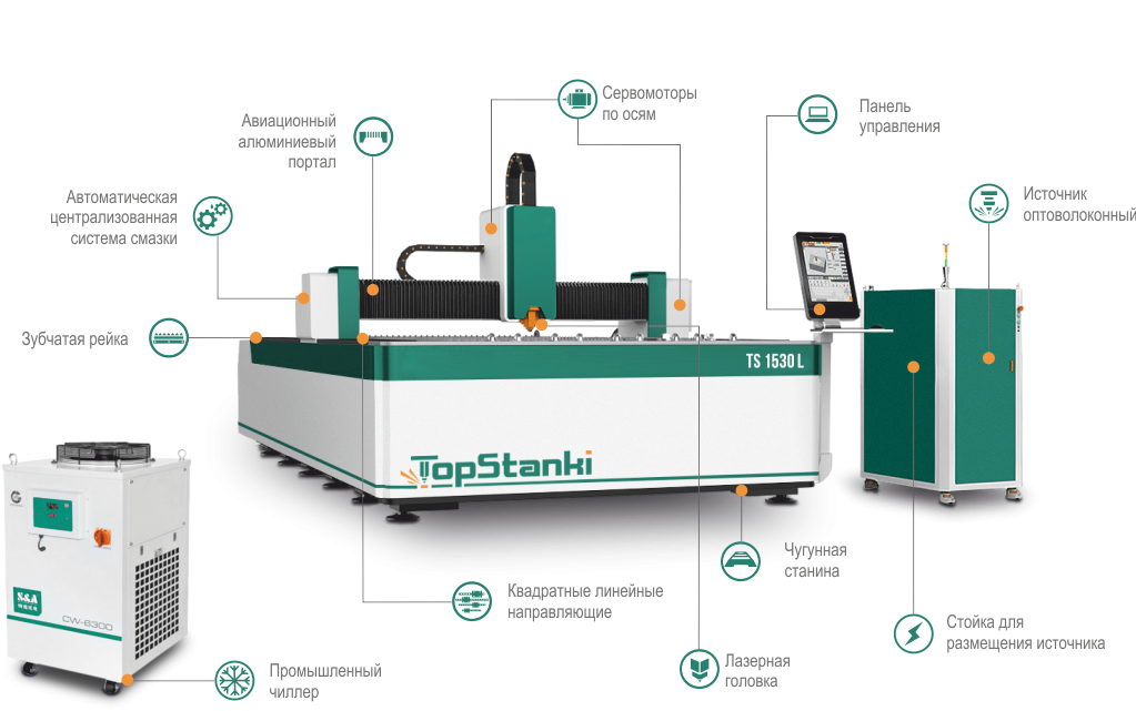 Станок лазерной резки по металлу TS1530D. Станок поставляется с лазерным источником IPG мощностью 3000 Вт, серия лазерного источника YLR-3000-U, производства Россия, г. Фрязино.