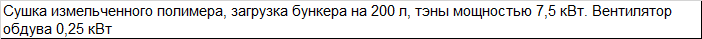 | Сушка измельченного полимера, загрузка бункера на 200 л, тэны мощностью 7,5 кВт. Вентилятор обдува 0,25 кВт |