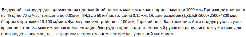 | Выдувной экструдер для производства однослойной пленки, максимальная ширина намотки 1000 мм, Производительность на ПВД до 70 кг/час, толщина до 0,05мм, ПНД до 60 кг/час толщина 0,15мм, Общие размеры (ДхШхВ)5000x2500x4800 мм, Скорость протяжки 10-100 м/мин, Фальцующее устройство - 100 мм, Горячий нож, Вал тиснения, Авто поддув рукова, узел вращения головы, максимальная комплектация. Экструдер производит пленочный рукав из гранул, используется как для производства пакетов, так в аграрном и строительном секторе как укрывной материал |
