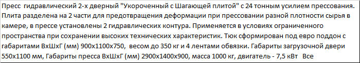 | Пресс гидравлический 2-х дверный "Укороченный с Шагающей плитой" с 24 тонным усилием прессования. Плита разделена на 2 части для предотвращения деформации при прессовании разной плотности сырья в камере, в прессе установлены 2 гидравлических контура. Применяется в условиях ограниченного пространства при сохранении высоких технических характеристик. Тюк сформирован под евро поддон с габаритами ВxШxГ (мм) 900x1100x750, весом до 350 кг и 4 лентами обвязки. Габариты загрузочной двери 550х1100 мм, Габариты пресса ВxШxГ (мм) 2900x1400x900, масса 1000 кг, двигатель - 7,5 кВт Все комплектующие по гидравлике импортные (Турция и Болгария), гарантия 2 года, срок службы 10 лет. |